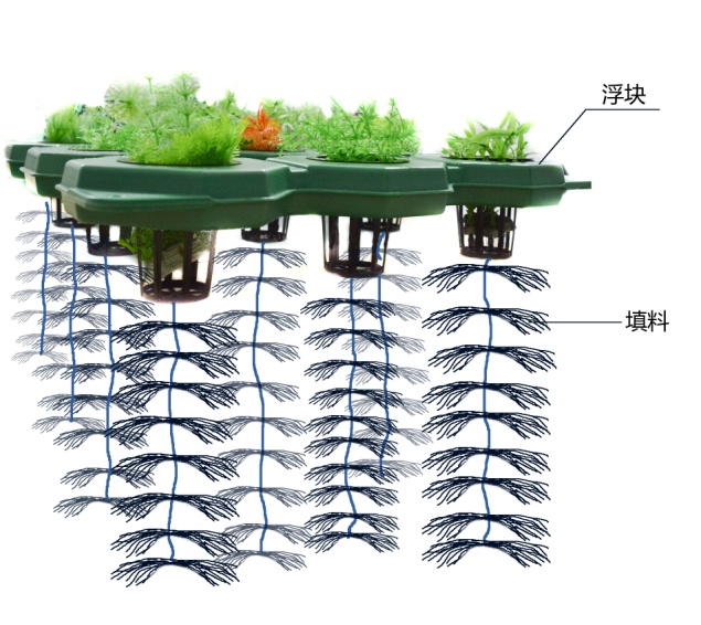 针对横一港河底硬化的特点,可以采用将生态浮床与生物填料结合的高效生态浮床技术,克服了传统水生植物对种植土的需求条件(1)技术组成及特点