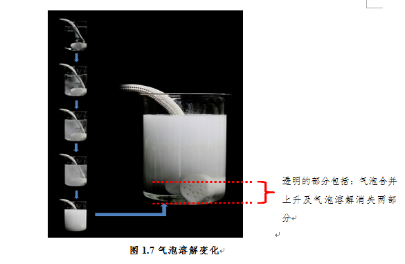微纳米气泡内部的压力远远大于外界液体的压力,可以将更多的气泡内的气体溶解到水中,并伴随有自身溶解消失的现象。